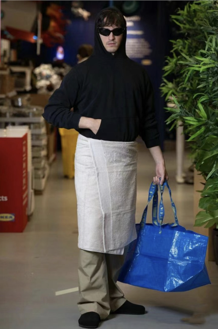 瑞典家居用品零售商IKEA在巴黎世家“浴巾裙”发布后,很快用自己的VINARN浴巾拍了个广告,以黑色连帽衫、黑色墨镜、米色裤子和黑色皮鞋来模仿巴黎世家,还别说,真有点“巴里巴气的”。