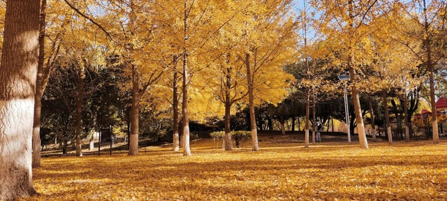 欣赏公园的银杏林,从南门进入,在儿童乐园附近就可看到银杏大道,大片的银杏林,落叶缤纷,旧绿与新黄交替,漫步在兴隆公园的银杏大道上,一抹抹明媚的金黄,渲染了满园的时光。