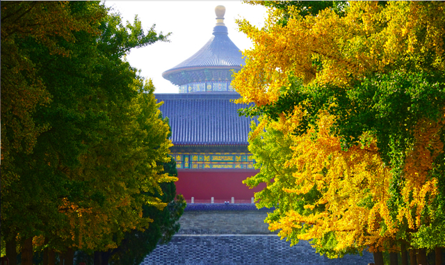 日坛的银杏配红墙,是极具代表性的颜色搭配。公园内植被古树茂密,池塘水榭和杏林古树交相辉映,生态环境十分优美。