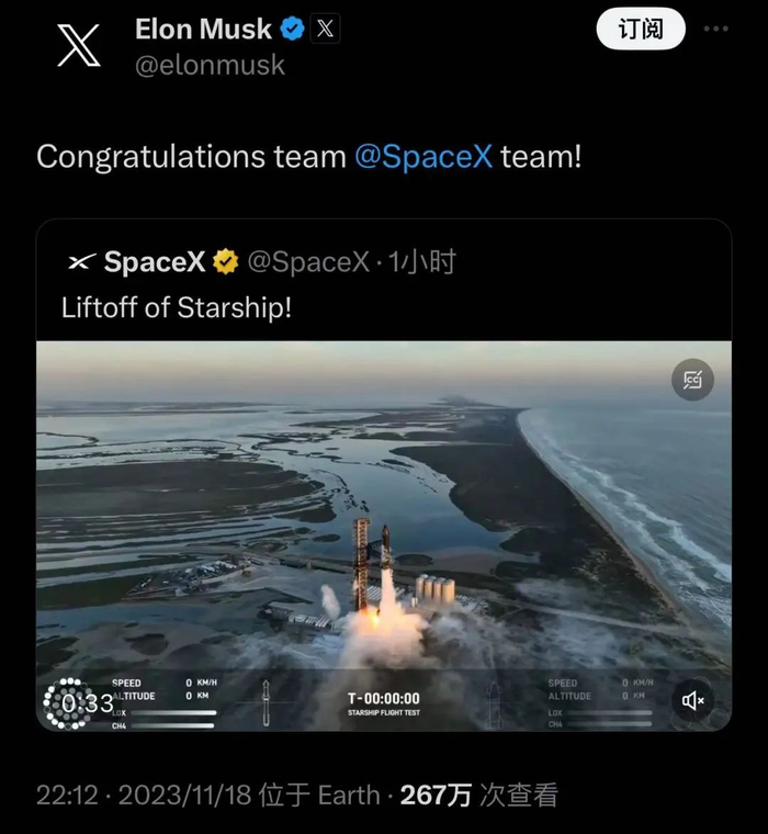 同日,SpaceX公司首席执行官马斯克在社交媒体X(原推特)上发帖称,“祝贺SpaceX公司的团队!”他还转发了约一个小时前SpaceX公司账号发布的“星舰”发射时的视频。