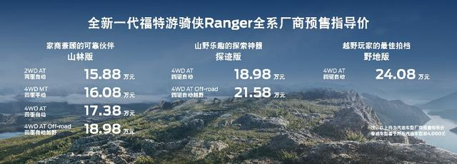 全新一代福特游骑侠Ranger将提供汽油和柴油两种动力选择,汽油版厂商预售指导价为15.88万元-24.08万元,柴油版基于对应汽油版加4000元。新车共推出山林版、探迹版和野地版三大系列14款车型。