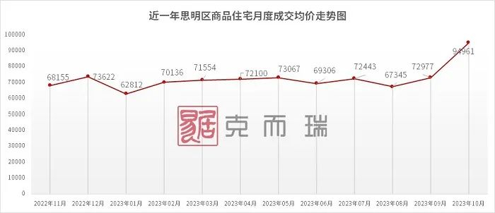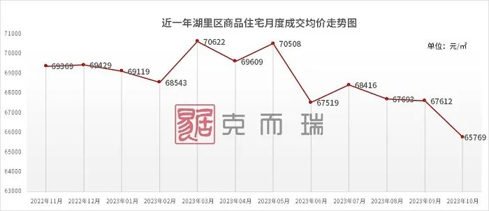 同时,克而瑞福建区域数据显示,10月湖里区商品住宅均价约65769元/平米,环比微跌2.73%。从近一年湖里区商品住宅月度成交均价走势图来看,其从2022年11月69369元/平米下降到2023年10月65769元/平米。
