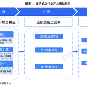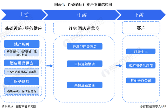 中国连锁酒店产业链上游主要包括地产开发、房屋设计、建材供应等地产相关供应商,洗漱用品、床单等酒店用品提供商,酒店系统软件、保洁人员培训等服务提供商等;产业链中游主要是各类档次连锁酒店运营商;下游主要包括个人以及旅游服务供应商等。