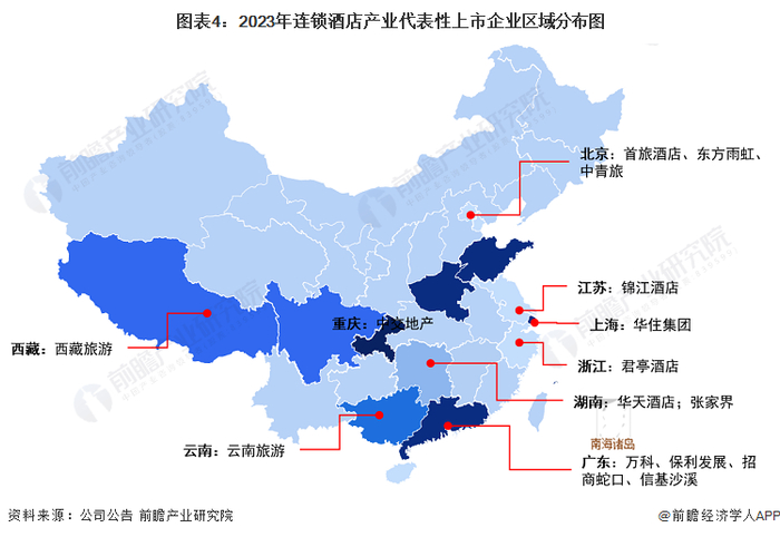 从代表性企业分布情况来看,我国连锁酒店代表企业分布在北京、江苏、上海、浙江、广东等沿海省市,以及云南、西藏、重庆等旅游热点省份。