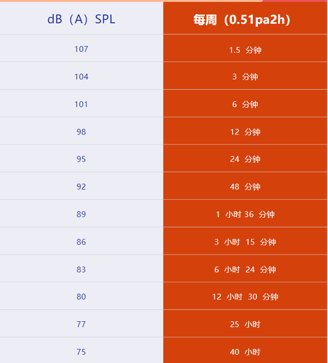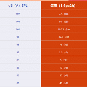关于如何正确使用耳机,世界卫生组织(WHO)已提出明确的建议:成年人使用耳机声强80分贝(dB SPL)时,每周不应超过40小时;如果耳机声强超过80分贝(dB SPL),则使用时间应相应缩短。例如,耳机声强为101分贝(dB SPL),则每周使用时间就不宜超过18.75分钟(如下图)。