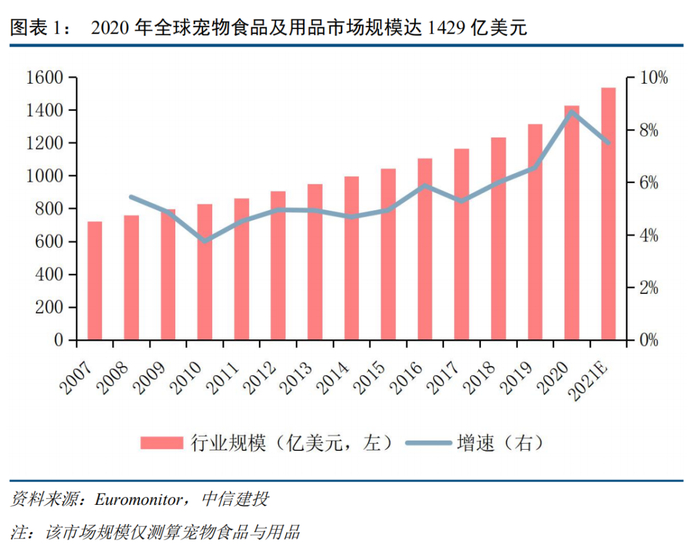 全球宠物行业以美欧为主要市场,龙头企业多集中在美国。2020年全球宠物食品及用品市场规模达1429.32亿美元,同比增长8.7%,预计2021年有望达1536亿美元。2010年至2020年CAGR为5.16%,行业进入稳健增长期。