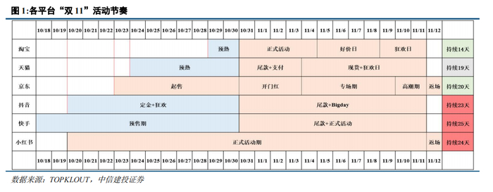“双11”竞争愈发激烈,内容平台与传统电商平台策略略有差异。从整体“双11”情况来看,平台竞争更加激烈,赛道愈发拥挤,视频号正式加入大促行列,B站、小红书等平台开始备战“双11”。从活动节奏来看,TOPKLOUT数据显示,淘宝、天猫、京东、抖音、快手、小红书“双11”开始时间分别为10/29、10/24、10/23、10/20、10/18、10/20,持续天数分别为14、19、20、23、25、24。内容平台与传统电商平台展现出不同的营销策略,内容平台采用抢跑策略拉长战线,传统电商平台则缩短活动周期,强化电商氛围。