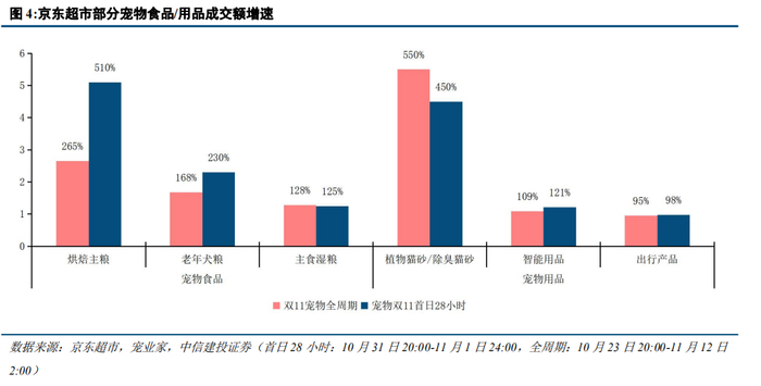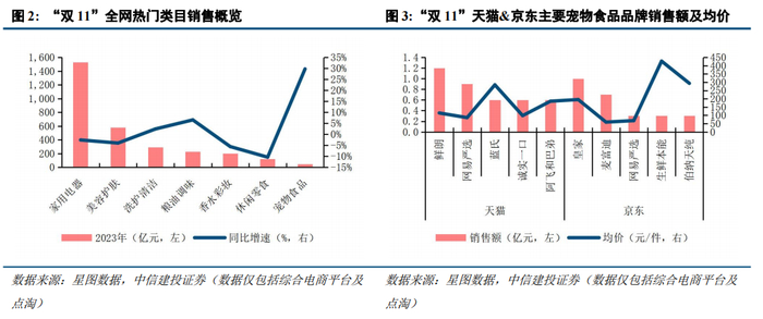 京东超市烘焙粮、老年犬粮及主食湿粮销售额增长明显。京东超市发布2023年“双11”宠物全周期战报(10月23日20时至11月12日2时),战报显示,京东宠物新用户同比增长超32%,破百万宠物爆品数量同比增长48%,直播成交同比增长121%。从细分品类来看,在宠物食品方面,“双11”期间京东超市宠物烘焙主粮成交额同比增长265%,老年犬粮成交额同比增长168%,主食湿粮成交额同比增长128%;在宠物用品方面,植物猫砂成交额同比增长550%,智能用品成交额同比增长109%,宠物出行产品成交额同比增长95%;京东超市宠物“双11”全周期热卖品牌榜TOP10分别是:皇家、麦富迪、网易严选、渴望、伯纳天纯、爱肯拿、pidan、素力高、冠能、instinct。此外,在京东平台上,宠物行业直播成交同比增长超121%。京东超市宠物携手超百家宠粮品牌及工厂发起业内最大规模联合采购计划,采购宠物食品总计超2600万件,同比增长超32%,采购成本同比下降10%。京东宠物健康战报显示,10月23日20时-11月11日24时,京东宠物健康产品成交额同比增长超38%,成交额同比翻倍的品牌超142个,全周期京东宠物健康共服务超203万用户,宠物互联网问诊订单超155万。