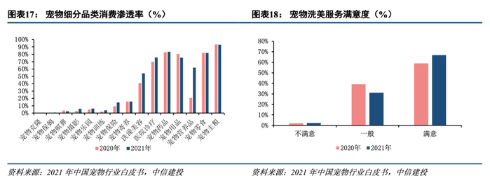 宠物医疗消费占比从19%上涨至2021年29.2%,增加10.2pcts。宠物主购买智能用品的比例由43.1%增至52.9%。宠物洗美和宠物保险等新兴领域消费渗透率亦提升明显。