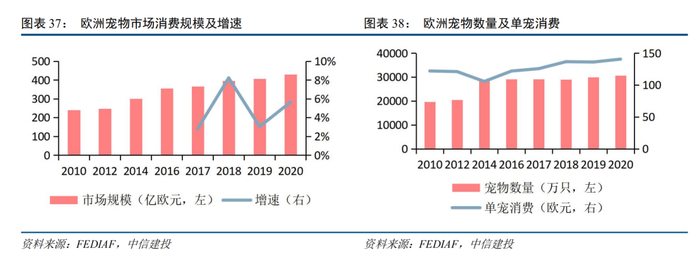 欧洲宠物行业进入成熟发展阶段。2020年欧洲宠物产业市场规模430亿欧元,同比增长5.7%;其中宠物食品市场约218亿欧元,宠物用品及服务212亿欧元。欧洲宠物猫占比最高。宠物食品市场干湿粮占比相同,高端主粮市场份额最大。宠物用品及服务以传统渠道为主,市场集中度相对较低。