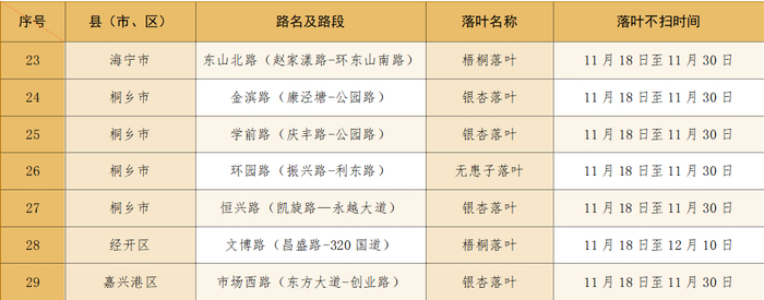 11月17日至12月31日期间,杭州23条道路(街巷)、13条河道园路开启“落叶不扫”模式。