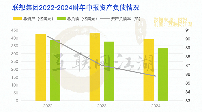 结果呢,2020年/21财年,联想的资产负债率最高达到了90.5%,此后两年分别为87.88%和84.46%,最新的2024财年中报显示,资产负债率降到了85.79%。
