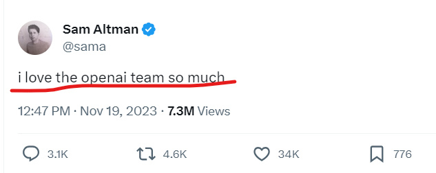 奥特曼的最新推文说他“太爱OpenAI团队”了,这条推文让人遐想联翩:是OpenAI的员工支持他重新回归,让他高兴之余发了这条推文?还是这只是一句简单的告别语?