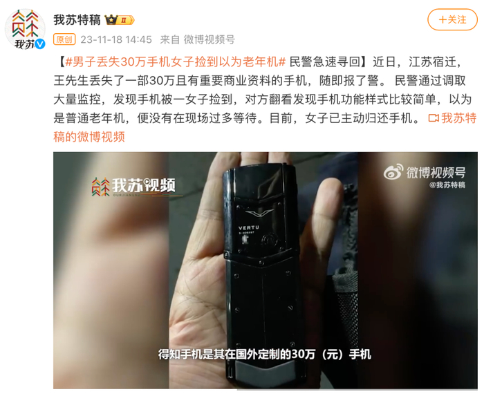 30万元钱含有重要商业资料的手机轻易丢失被翻看不说,被捡到的人以为是100多块钱的普通老年机就更让人啼笑皆非了