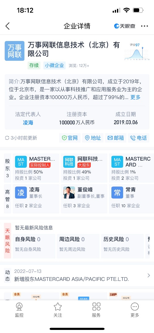 万事网联公司是万事达公司(MasterCard)与网联清算有限公司在中国境内共同发起设立的合资公司。天眼查信息显示,万事网联公司注册金额为10亿元,万事达公司通过旗下公司合计持股51%,网联清算有限公司的全资子公司网联科技有限公司持股49%。万事网联公司的董事长为万事达卡亚太区联席总裁凌海。
