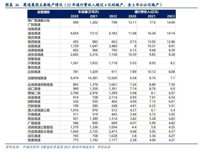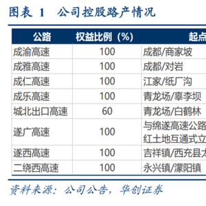 1、公司路产均为国道或省道干线高速公路,多为区域交通要道,包括成渝高速、成雅高速、成乐高速、成仁高速、城北出口高速、遂西高速、遂广高速、二绕西高速,通车总里程约858公里。2021年剥离地产开发业务。