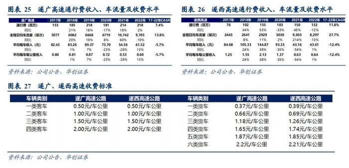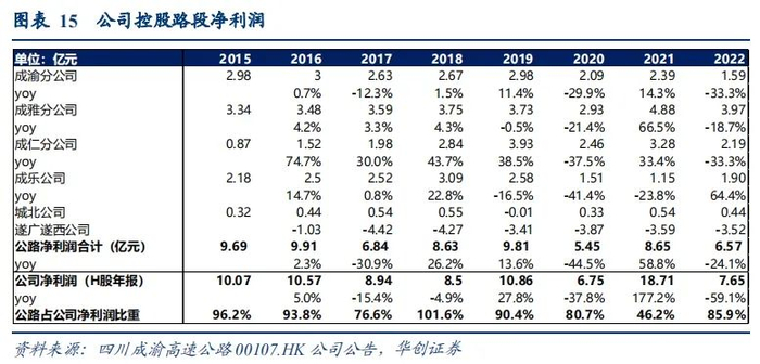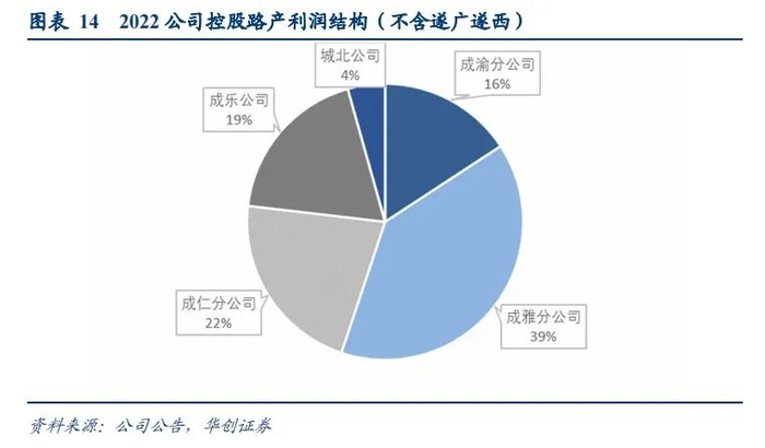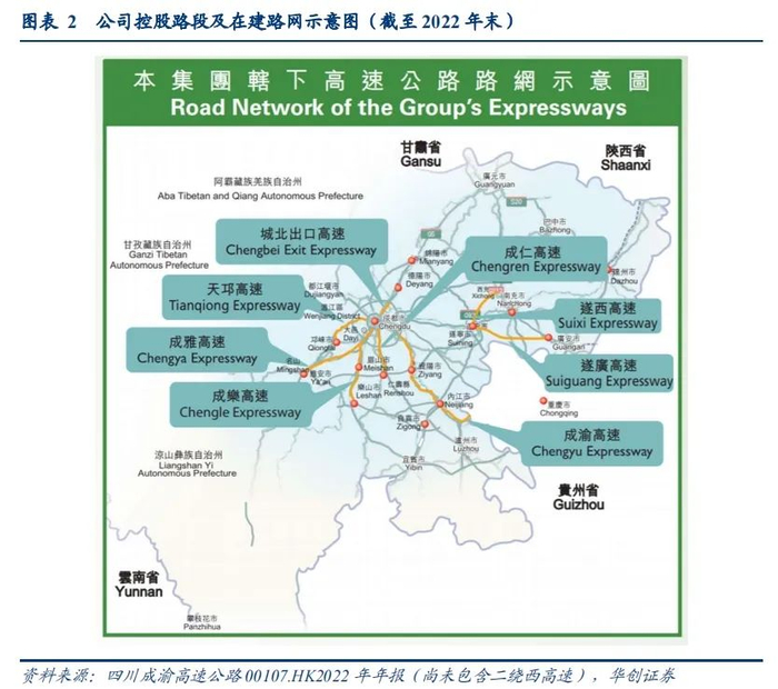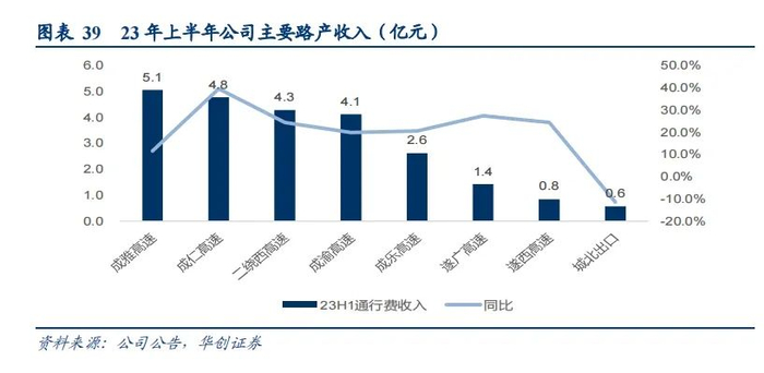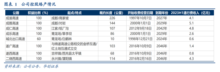 截至2023H1,公司辖下高速公路通车总里程约858公里,包括成渝高速、成雅高速、成乐高速、成仁高速、城北出口高速、遂西高速、遂广高速、二绕西高速等位于四川省境内的高速公路全部或大部分权益。