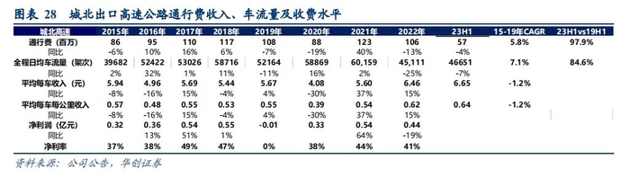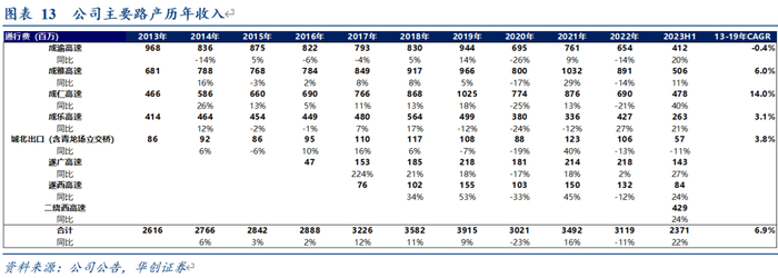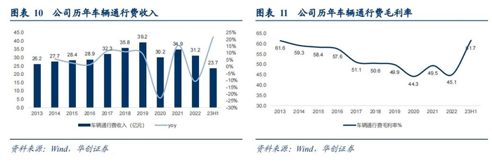 1)通行费收入,2013-19年CAGR7%,2020-22年受到疫情影响有所波动,23H1通行费收入超过19H1(含收购路产)。