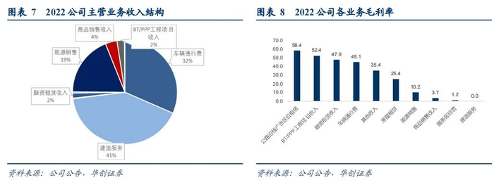 毛利:2022年车辆通行费毛利率为45.06%,毛利润为14.05亿元;能源销售业务毛利率为10.19%,毛利润为1.9亿元;两者合计占2022公司毛利润的约9成。