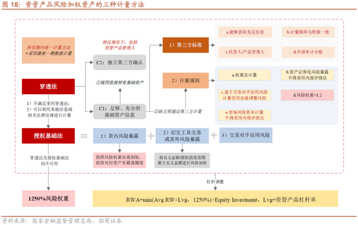 授权基础法是利用资管产品募集说明书、定期报告、资管产品披露的其他信息等划分大类资产,并使用相应权重进行计量,且若同类风险暴露拥有多个风险权重时,商业银行应采用最高权重。