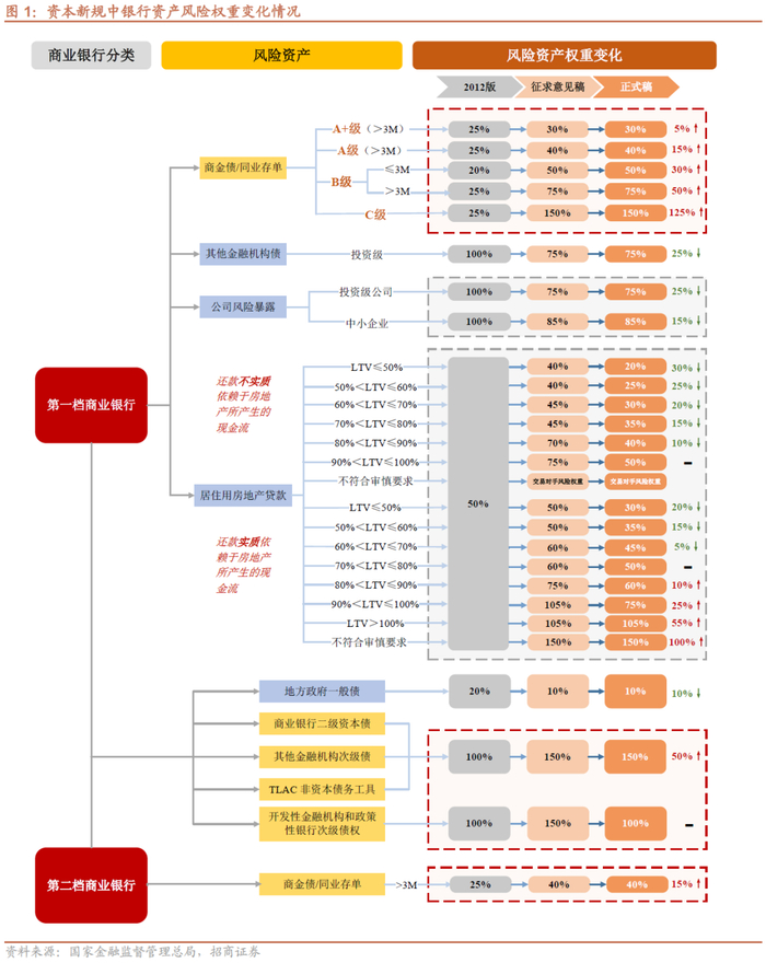 5)按照LTV(贷款价值比)区间,细分居住用房地产风险暴露的风险权重,原个人住房贷款权重为50%,意见稿中平均调升15个百分点[1]左右。