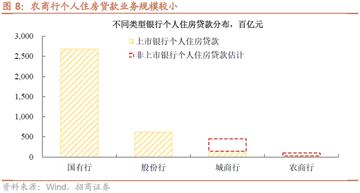 个人住房贷款集中于国有行,农商行存量偏低,其对冲同业风险资产规模上行力度较弱。具体测算过程分为四步:1)已知央行公布的最新个人购房贷款余额为38.6万亿,半年报中各上市银行个人住房贷款合计约34.8万亿,其中,国股行个人住房贷款占比94.9%,城农商行占比分别为4.2%、0.9%;2)第一步中两项差额,代表着非上市银行部分的个人住房贷款,约3.8万亿元;3)假设个人房贷基本由国股行及城农商行发放,且国股行均为上市银行,而城农商行中相当部分为非上市银行,如果非上市城农商行房贷比例,与上市城商、农商银行房贷比例一致,那么估算得到非上市城商行、农商行住房贷款余额为3.1万亿、0.7万亿;4)调整后得到不同类型银行个人住房贷款的合计值(上市+非上市),国有行/股份行/城商行/农商行占比分别达到69.6%、16%、11.8%和2.6%。由于农商行住房贷款业务规模偏小,其对同业风险资产上行的对冲力度最弱。