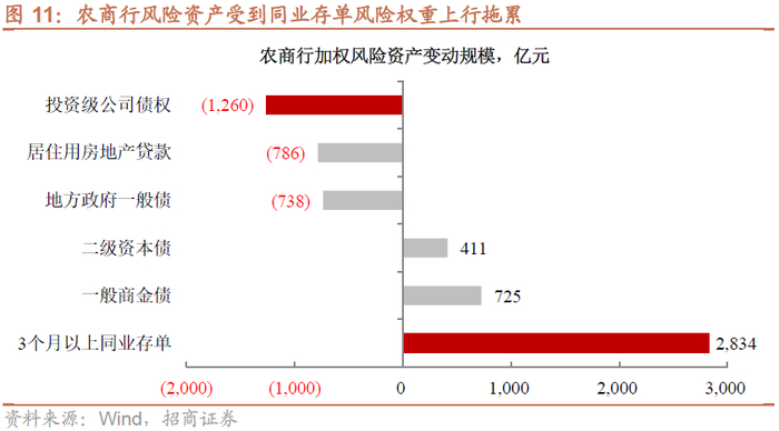 对于城商行,居住用房地产贷款对风险资产下降的贡献率最高,远超地方政府债。城商行个人住房贷款在零售贷款中占比较高,其主要依靠区域优势开展购房贷款业务,而从2021年起,房地产贷款集中度管理制度开始实施,特别是控制中资小型银行(包括多数城农商行)的房地产贷款、个人住房贷款在各项贷款余额中的占比不超过22.5%、17.5%,因此,对于这两类银行而言,住房贷款资产遏制资本充足率下行的力度反而弱于股份行。农商行的另一个不利因素在于,同业存单作为其优质资产,持仓量级偏大,形成对资本充足率的整体拖累。