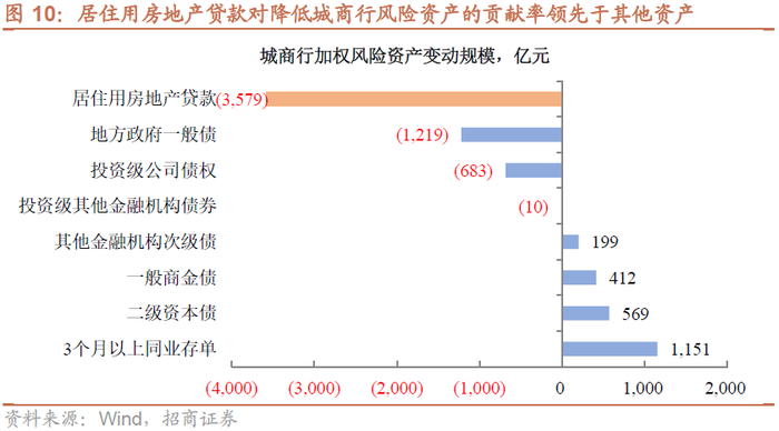 分银行类型来看,农商行加权风险资产规模有抬升迹象,股份行、城商行反之。对于股份行,地方政府一般债、居住用房地产贷款对风险资产缩量的贡献率均在65%左右。实际上,大中型银行具有一定地方债承接功能,而随着银行参与化债进程,以地方政府债置换城投债,造成净息差收窄的可能性较大,地方债权重的降低也有缓释资本压力的考虑。相比之下,二级资本债则使股份行风险资产面临大幅增长。