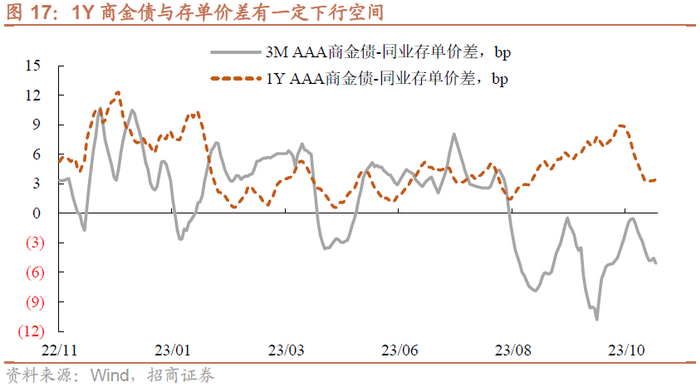 同业存单利率居高不下,是否有新规即将落地的影响?近期存单供不应求,供给方面,11月存单到期规模不小,净供给存在缺口;需求方面,大行承接地方债及新增国债过程中负债端压力有所提升,扩大存单发行需求,而理财季节性配置也同步回升。供给缺口主导下,当前1年AAA同业存单价格升至2.55%附近,1Y-6M存单期限利差趋近0值,而6M-3M利差尚存小幅下行空间,可见在供需因素之外,也蕴含着长端同业存单确定性不及短端的担忧。若需求压力缓释,中小行明年大幅减持或减少存单发行的可能性也并不大,一方面,吸储能力不足,导致其需要通过存单补充资金,另一方面,以非市场化因素互持、套利等为目的的资金,对存单的承接能力同样不宜低估。相比之下,8月以来资金有所收紧,让1年AAA商金债流动性溢价抬升,而本月商金债-存单价差主要是被动压缩。