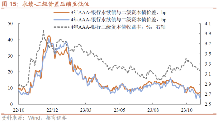 二级资本债近期估值走势,也显示出其在与银行永续债的比价中,处于弱势地位。11月以来,3年/4年AAA-永续-二级价差均逼近甚至突破去年10月以来低点,是市场对供给端压力的情绪反映,新规正式稿发布当周,二级资本债配置显著回暖,但二永价差维持低位,刻画出其“远虑”仍然存在。