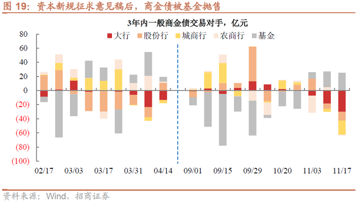 具体影响或有两条路径:其一是引发银行寻求其他机构代持次级债的行为,其二是银行自营可能提前赎回部分公募委外产品。不过,前者逐渐受到监管规范,早在17-18年资管新规整治下,同业委外套利基本告一段落,当前此类行为不乏限制;对于后者引发的赎回风险,反而更值得注意,实际上,在资本新规征求意见稿发布后一段时间,二永配置已经过一轮压力测试,期间银行自营对二级资本债单周净卖出最高达到44.4亿(3/10当周),而彼时基金对一般商金债也出现大幅抛售。