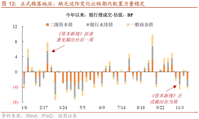 新规落地将引发存单、二级债及商金债定价调整,可能影响有多大?从今年市场表现看,2月资本新规征求意见稿出台后一周,二永及商金债出现大幅高估值成交,银行债抛售力度仅次于9月初,但在正式稿发布当周,银行债配置反而达到6月以来最强。整体来看,不可否认风险权重的变化将促使银行直接及委外减持同业资产,但一方面,新规落地倾向于是一个渐进过程,从正式稿落地后市场反应来看,当边际缺乏变化时,很难出现剧烈抛售力量;另一方面,在历史行情中,二永的涨跌往往由广义基金力量推动,即使部分银行委外也会以广义基金资金形式进入市场,银行较公募基金对二永的偏好更弱,其直接减持对银行债(特别是长端)定价影响或小于市场预期。