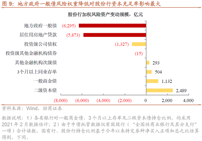 主要资产风险权重的变化,将整体降低商业银行风险资产规模,并提高资本充足率约7.7bp。在权重变化的资产中,3个月以上同业存单对银行资本充足率造成的影响最大,尽管二级资本债、其他金融机构次级债的风险权重涨幅显著,但受限于存量规模,品种引起影响弱于存单。地方政府一般债、居住用房地产权重降低对资本充足率的补偿,则能够完全覆盖前述冲击。