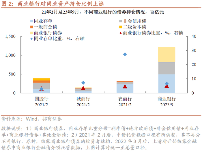 [3]采用银行对商业银行债券、同业存单托管余额之和,与其对债券托管总额作比得到,债券总额包括利率债、地方政府债、非金信用债、同业存单、商业银行债券及其他金融债。