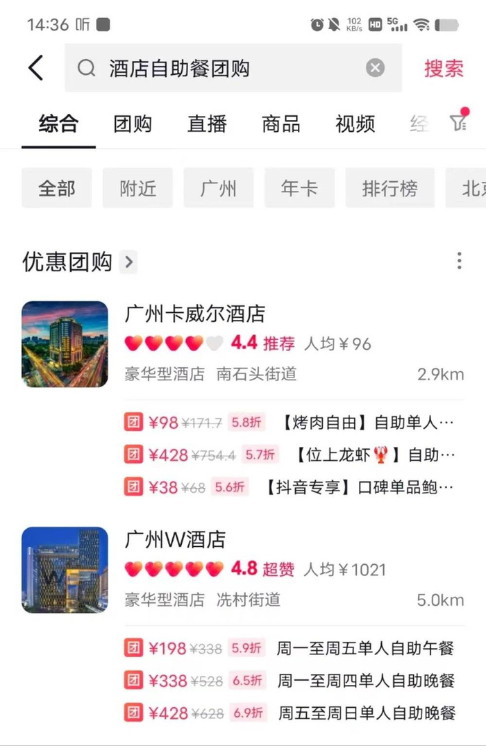 在餐饮方面,星级酒店上架了自助餐团购套餐。