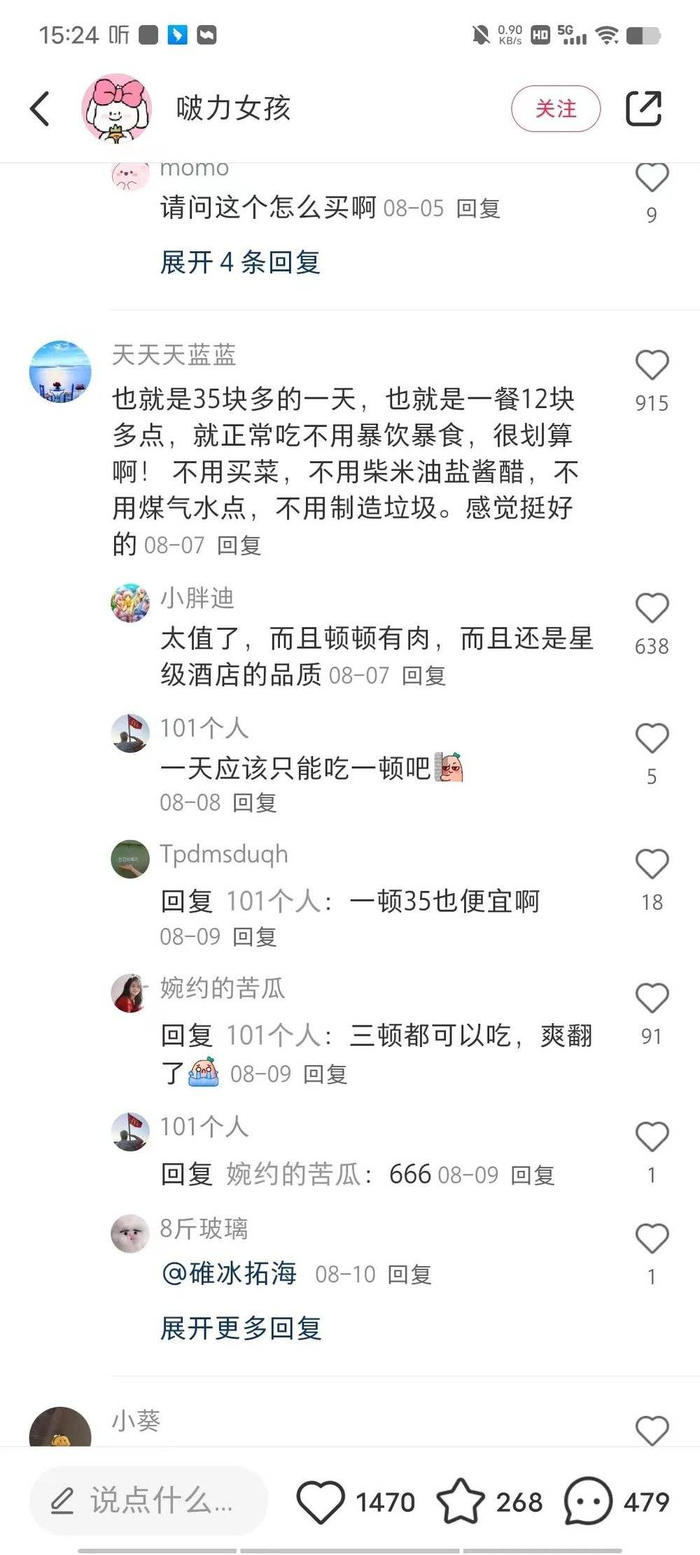 一时间,评论区涌入了各种“慕者”“嫉妒者”“理性分析者”,关注度极高。一餐十二块,不用自己做饭,不用制造垃圾,顿顿有肉,品质上乘,简直“爽翻了”!