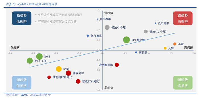 3、综合来看,当前大盘成长风格配置价值较高。从风格因子赔率-趋势-拥挤度图谱来看,在进行标准化处理之后,相较于其他因子,小盘风格相对赔率较低,趋势中等,拥挤度高,建议低配;成长风格处于高赔率-弱趋势-中低拥挤度状态,相对于红利价值因子性价比较高。