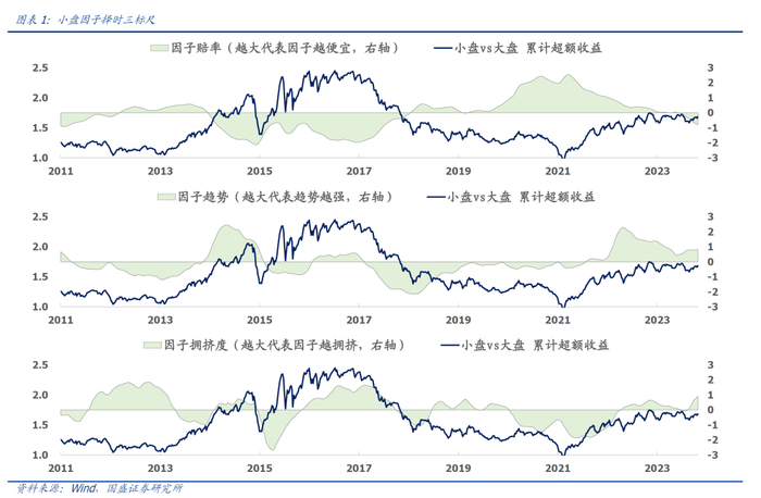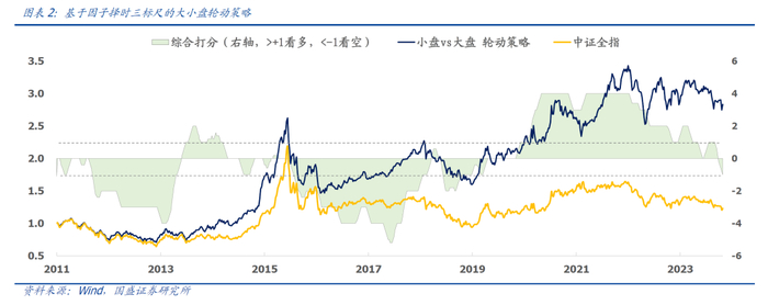 从上述三个标尺的角度出发,图表1说明当前小盘因子处于“中低赔率-强趋势-高拥挤”的状态,三个指标中已有两个指标为负向得分。从图表2的历史得分可以看出,基于三标尺的大小盘轮动策略长期跑赢基准,且综合得分领先于小盘超额;小盘风格在经过两年多的强势之后,综合得分近一个月由正转负,当前已降至-1,大小盘轮动策略模型指向大盘风格。