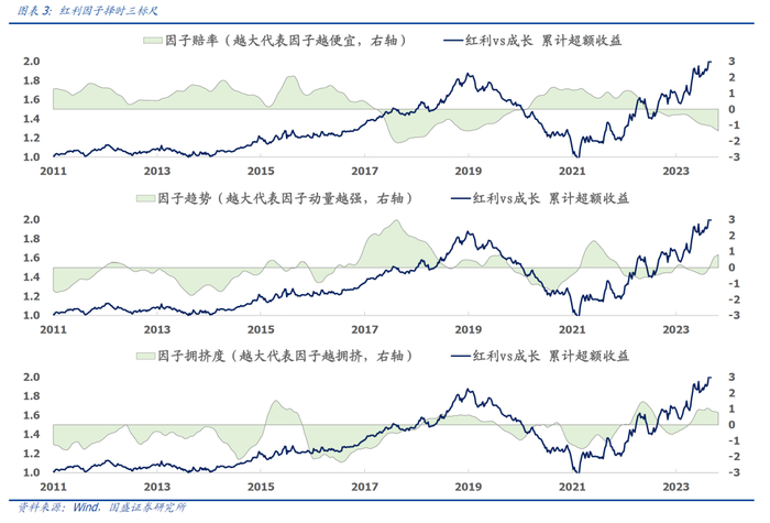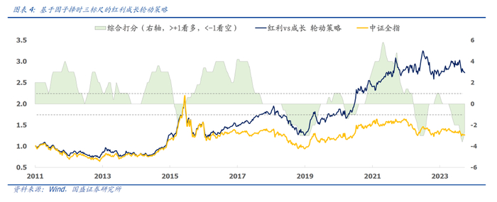 图表3显示红利因子当前处于“低赔率-强趋势-高拥挤”的状态,与小盘因子相似,除趋势外,赔率与拥挤度得分均为负;图表4中红利成长轮动策略同样长期跑赢中证全指,当前红利因子三标尺综合得分为-2,需警惕其交易风险,红利成长轮动模型指向成长风格。