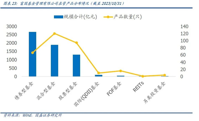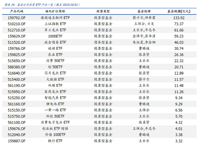 富国基金旗下ETF产品线齐全,为投资者提供了全方位的指数投资工具。富国基金的ETF产品线非常全面,覆盖了宽基、主题、行业等多个类型,截至2023年10月31日,富国基金旗下已有44只ETF产品在管,总规模约607亿元。