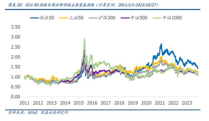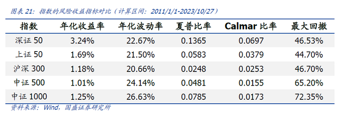 从各项风险收益指标综合对比来看,深证50指数具备较高的投资性价比。从业绩指标来看,深证50指数不仅年化收益率领先其他宽基指数,夏普比率、Calmar比率等风险调整后的收益指标也都处于领先的地位,因此深证50指数具备较高的投资性价比。