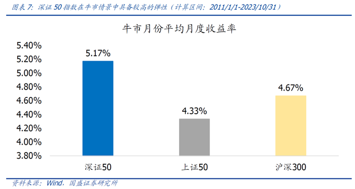4、作为大盘成长指数,深证50指数具备高弹性的相对优势。在历史三次市场底部反转的环境中,深证50反弹幅度相对而言较大。自2011年以来,深证50指数在权益牛市情景中平均月度收益率为5.17%,大幅跑赢上证50(4.33%)、沪深300(4.67%)等宽基指数。