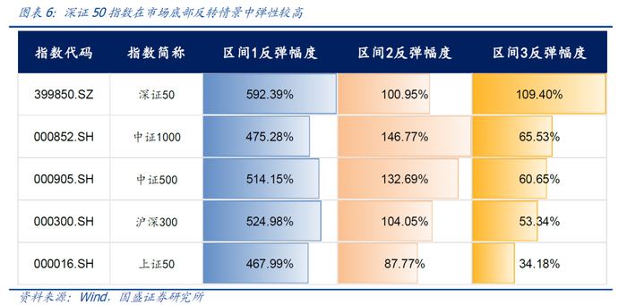在市场底部反转的情况下,深证50指数的底部弹性较高,反弹幅度较大。我们根据上证指数在历史上的表现划分出三次底部反弹区间,反弹区间1:2005/5/26~2007/9/27,反弹区间2:2008/10/23~2009/8/5,反弹区间3:2018/11/15~2021/12/22,测算了其他各个宽基指数在此区间的底部反弹幅度如下图所示,可以看到在市场从底部反转的时候,相比其他宽基指数而言深证50指数反弹幅度更大,具备明显的优势。
