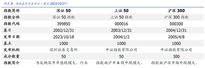从指数成分股涉及概念来看,深证50指数成分股在双循环、三新、新经济等概念上暴露度较高。从具体相关概念来看,深证50指数在双循环、三新、新经济等概念的暴露度分别为78.49%、70.27%、62.78%,而上证50指数在双循环、三新、新经济等概念的暴露度分别为45.36%、22.41%、44.54%。由此可见,深证50指数相比上证50而言,新经济属性更高,能够更好地代表经济结构转型下的未来发展趋势,未来有望引导资金流向最具成长性且符合我国产业转型的实体经济,从而助力实体经济高质量发展。