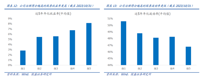 公司治理得分越高的股票长期来看具备更高的收益率和更低的波动率。我们按照深证50编制规则“按照公司治理得分从高到低依次入选”对深市A股进行分组回测,从组1到组5的公司治理得分依次增高,分组回测结果显示,平均而言公司治理得分越高的股票分组收益率越高,公司治理得分越高的股票分组波动率更低。深证50指数在编制过程中对成分股经过了公司治理得分的筛选,因此,长期来看深证50指数有望实现更高的收益率和更低的波动率。