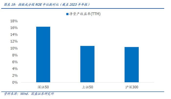 从指数基本面来看,深证50指数成分股ROE水平较高,盈利能力突出。截至2023年半年报,我们统计了指数成分股的ROE中位数,可以发现深证50指数的ROE水平显著高于其他主流宽基指数。未来如果行业竞争加剧,拥有更强的定价能力核心龙头企业的盈利有望出现更大的提升,深证50指数的盈利能力突出,未来或将具备较高的投资价值。