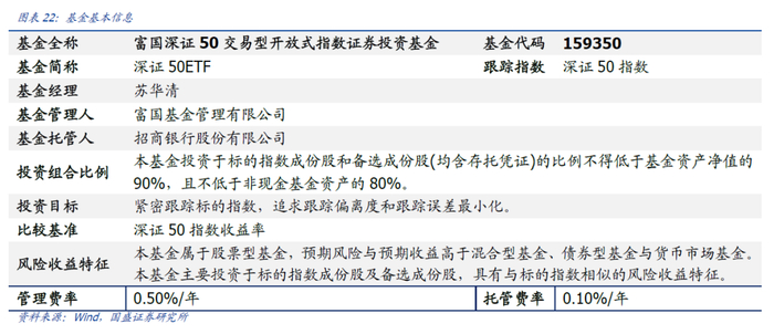 富国深证50交易型开放式指数证券投资基金(简称:富国深证50ETF;代码:159350),跟踪指数为深证50指数。基金发行日期为2023年11月20日,认购起止日为2023年11月20日至2023年11月24日。基金投资目标是紧密跟踪标的指数,追求跟踪偏离度和跟踪误差的最小化。