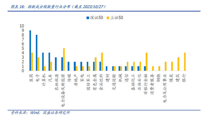 从成分股行业分布来看,深证50指数主要布局创新成长行业,具备鲜明的创新成长特征。从指数成分股的中信一级行业分布来看,指数涉及了19个中信一级行业,成分股数量最多的前几个行业分别是医药、电子、汽车、计算机,成分股数量分别为9只、8只、4只、4只。相比于上证50而言,深证50布局在医药、电子、计算机等行业的成分股数量更多,布局在银行、非银行金融、建筑等行业的成分股数量更少,可见相比上证50而言,深证50指数具备更高的创新成长属性。