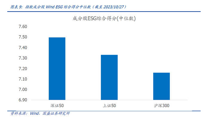 深证50指数在编制过程中,最大特色之一是做了“ESG负面剔除”,使得指数更具备“可持续性”。具体表现在深证50指数成份股的公司治理与ESG表现突出,具有长期可持续投资价值。深证50指数“剔除国证ESG评级在B以下的股票”,且选样时重点关注公司治理得分,使指数成份股具有较好的ESG评分与公司治理水平。公司治理有利于促进公司的规范化运作,而ESG关注企业在环境、社会和治理三个维度上的表现,这与我国的“可持续发展”理念较一致,使得指数具备长期投资价值。