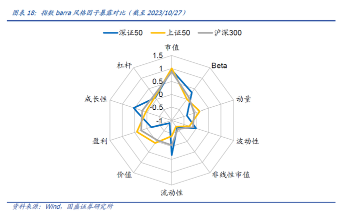 从指数风格因子暴露来看,深证50指数当前的风格总体为大市值、高流动性、高成长、高Beta。截至2023年10月27日,深证50指数当前在市值、成长性、流动性、Beta、杠杆等风格因子上为正向暴露,在价值、非线性市值、动量、盈利、波动性等因子上的为负向暴露。相比上证50和沪深300指数而言,深证50指数具备更高的流动性、更高的成长性和更高的Beta。